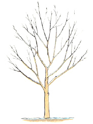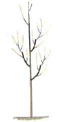 Young and newly planted trees should not be heavily pruned, unless damaged or broken branches exist, if so, remove with sharp and clean pruning shears. Keep in mind, every leaf on your tree is a food factory. Removing too many leaves at one time will stress the tree and may cause it to die. Remember the one third rule, never remove more than one third of a plant's foliage at a time. Once your tree is established and showing new growth, light corrective prunings are encouraged. As the diagram above illustrates, maintaining a central leader is very important. Remove any side branches competing with the central leader. Light pruning throughout the season is much better than severe pruning.