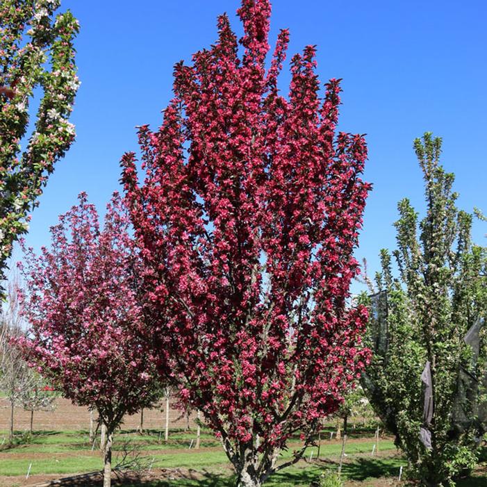 Buy Raspberry Spear® Crabapple online. Raspberry Spear® Crabapple is a beautiful introduction from J. Frank Schmidt & Son Co. that was selected due to excellent disease resistance, flower color, and columnar growth habit. Flower buds are produced and are dark pink and open to bright magenta flowers in early spring. The leaves are dark purplish-green, and in fall it will turn colors of orange and dark yellow. Fruit set happens in fall and are a stunning bright red in the winter landscape.