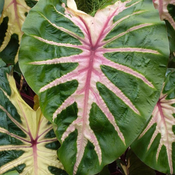 Buy Royal Hawaiian® Waikiki Elephant Ear online. Transform your garden into a tropical masterpiece with the stunning Royal Hawaiian® Waikiki Elephant Ear. This show-stopping elephant ear is celebrated for its glossy green leaves, dramatically accented by creamy white centers and vibrant flamingo pink veinsa true breakthrough in foliage color. Adding to its allure are the rich burgundy stems, which provide the perfect contrast to its bold, artistic leaves.