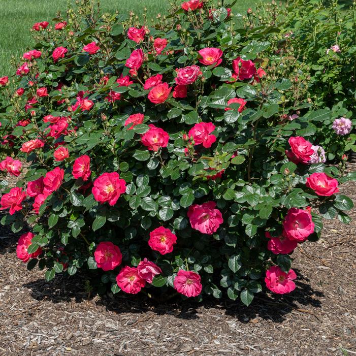 This rose bush features lush, glossy foliage that perfectly complements its dense, multi-stem structure. Ideal for enhancing landscapes, Brick House® Pink Floribunda Rose is perfect for borders, pathways, and entrances, effortlessly adding a pop of hot color to any setting.