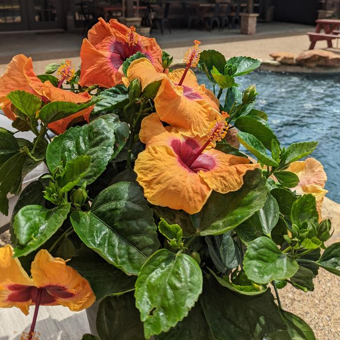 Buy Hollywood® Disco Diva™ Tropical Hibiscus online. Transform your garden into a tropical paradise with Hollywood® Disco Diva™ Tropical Hibiscus! This stunning hibiscus dazzles with bold, swirling blossoms that combine rich creamsicle orange, vibrant ruby magenta, and captivating fuchsia. The flowers seem to dance on their stems, their large, ruffled petals reminiscent of a diva twirling on a sunlit stage.