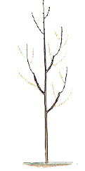 Young and newly planted trees should not be heavily pruned, unless damaged or broken branches exist, if so, remove with sharp and clean pruning shears. Keep in mind, every leaf on your tree is a food factory. Removing too many leaves at one time will stress the tree and may cause it to die. Remember the one third rule, never remove more than one third of a plant's foliage at a time. Once your tree is established and showing new growth, light corrective prunings are encouraged. As the diagram above illustrates, maintaining a central leader is very important. Remove any side branches competing with the central leader. Light pruning throughout the season is much better than severe pruning.