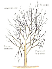 As your tree begins to grow prune back branches that may become to heavy. Lightly pruning side branches will also cause the tree to become fuller. If you regularly prune out broken, diseased or crossing branches, you will avoid future problems and have a healthy, attractive tree.