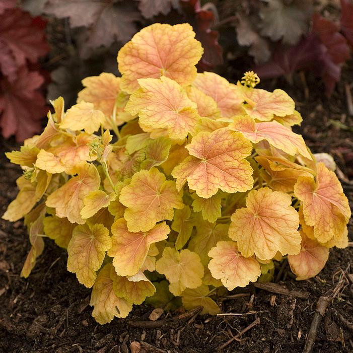 Buy Tiramisu Coral Bells online. Wonderfully colorful, this coral bells just may be one of the most popular Heuchera cultivars. Spring foliage is chartreuse with plum red veins. Fall foliage is red with golden veins and margins. Pinkish white flowers in summer top off the entire package.