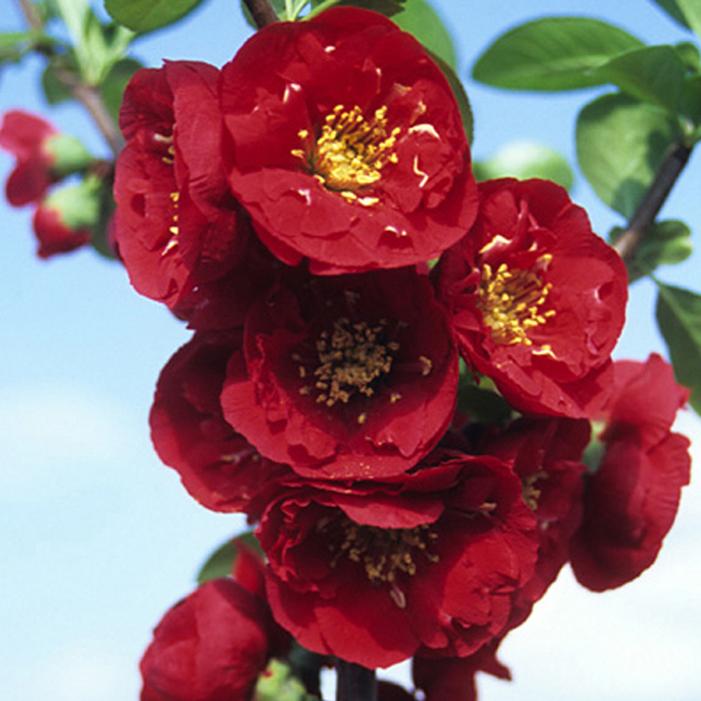Buy Red Premier™Quince online. A vigorous shrub with a dense form, intertwining branches and beautiful early spring double red flowers.