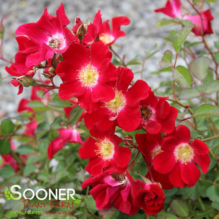 Buy Red Meidiland® Rose online. Makes you put on the sunshades, as this rose has glowing, bright red flowers with yellow centers that maintain their color without fading. The plant mounds as a groundcover. It is a solid performer in cold climates.